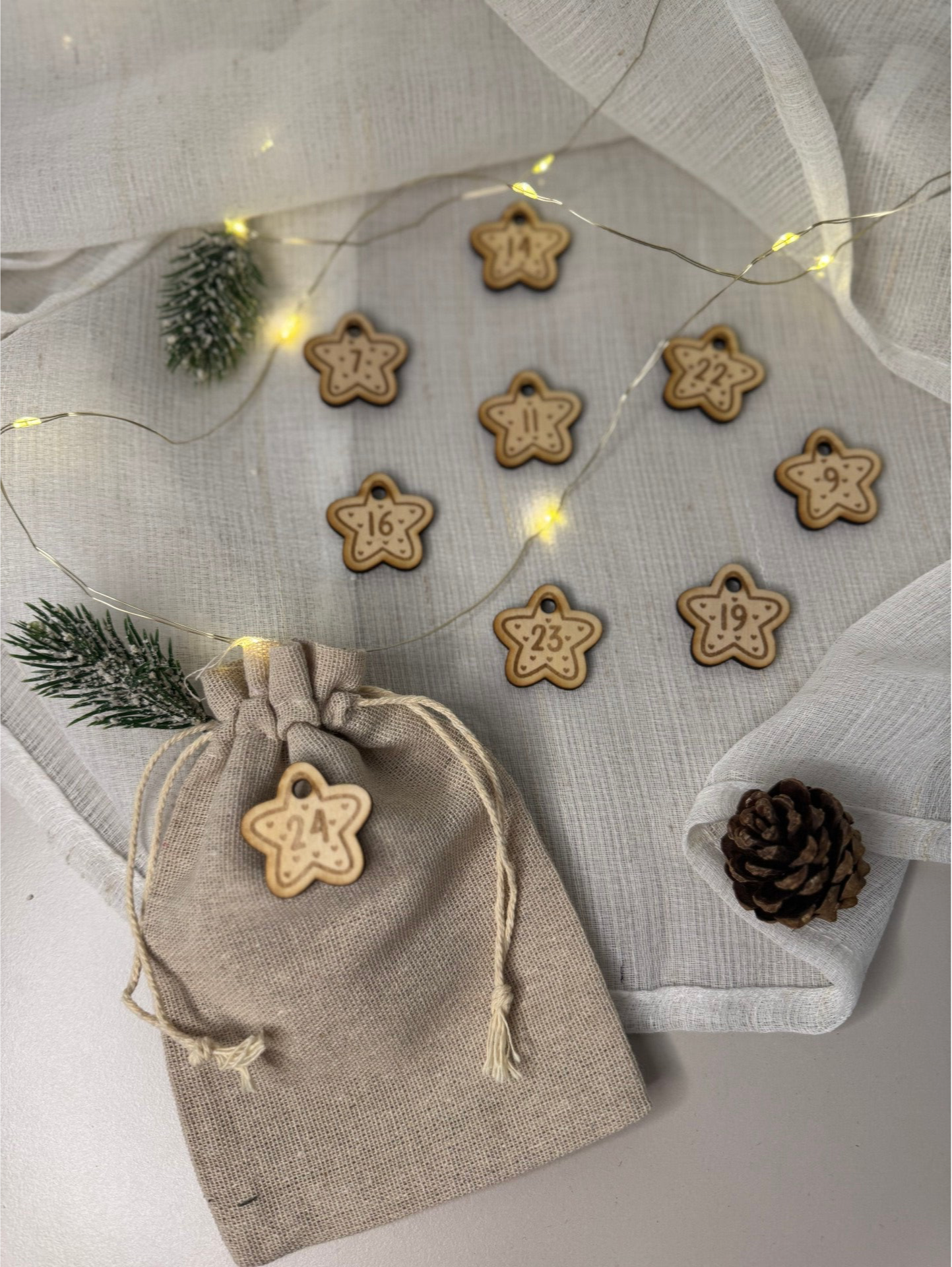 Unsere 24 handgefertigten Adventskalender-Anhänger aus Holz sind die ideale Ergänzung für deinen selbstgemachten Adventskalender – liebevoll, nachhaltig und jedes Jahr wiederverwendbar.