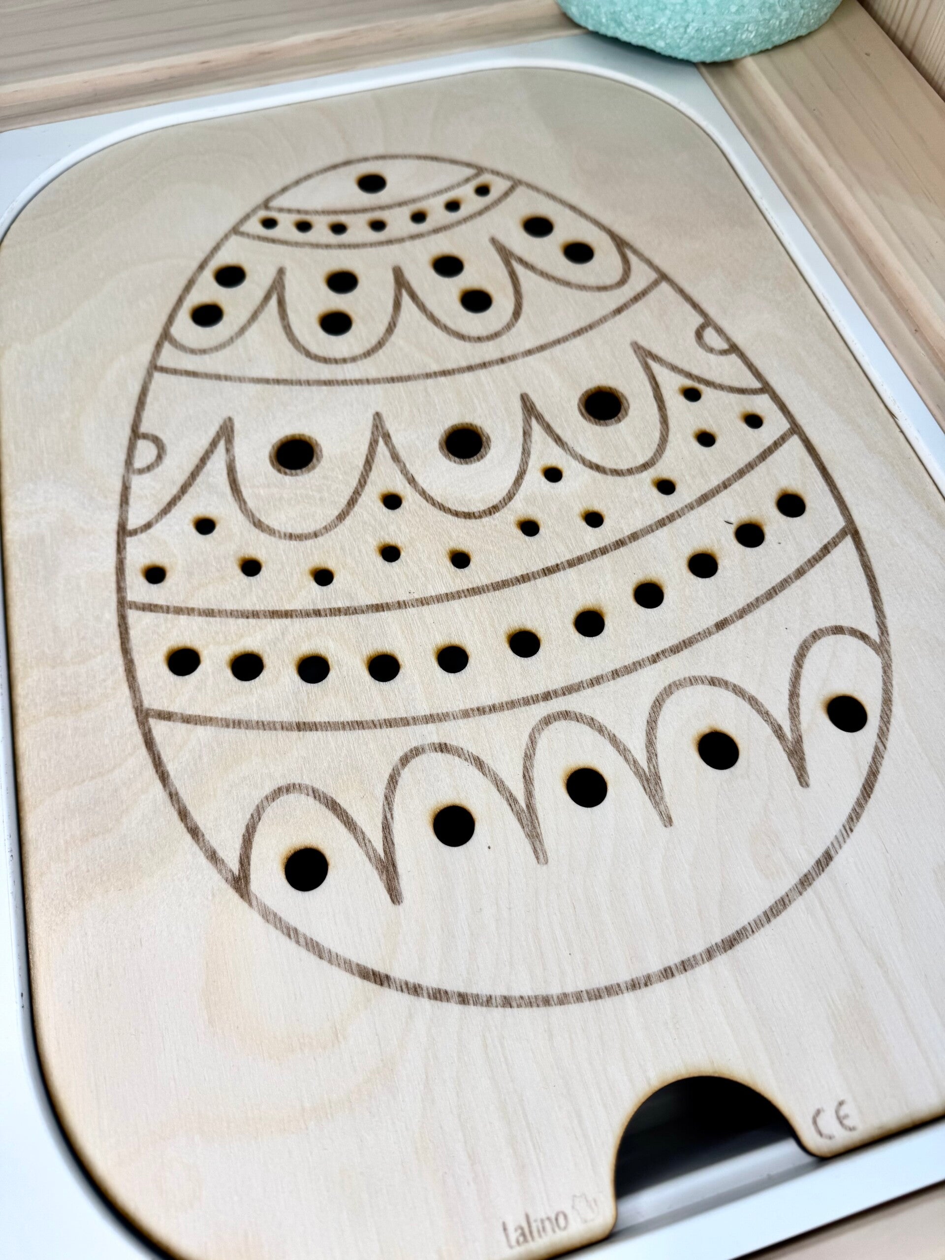 Die praktische Lernplatte Ei mit Löchern fördert spielerisch die Feinmotorik und Konzentration von Kindern. Durch die integrierten Löcher können Schnüre, Stäbe oder passende Steckelemente eingeführt werden – ideal zum Üben von Greifen, Stecken und Koordination.